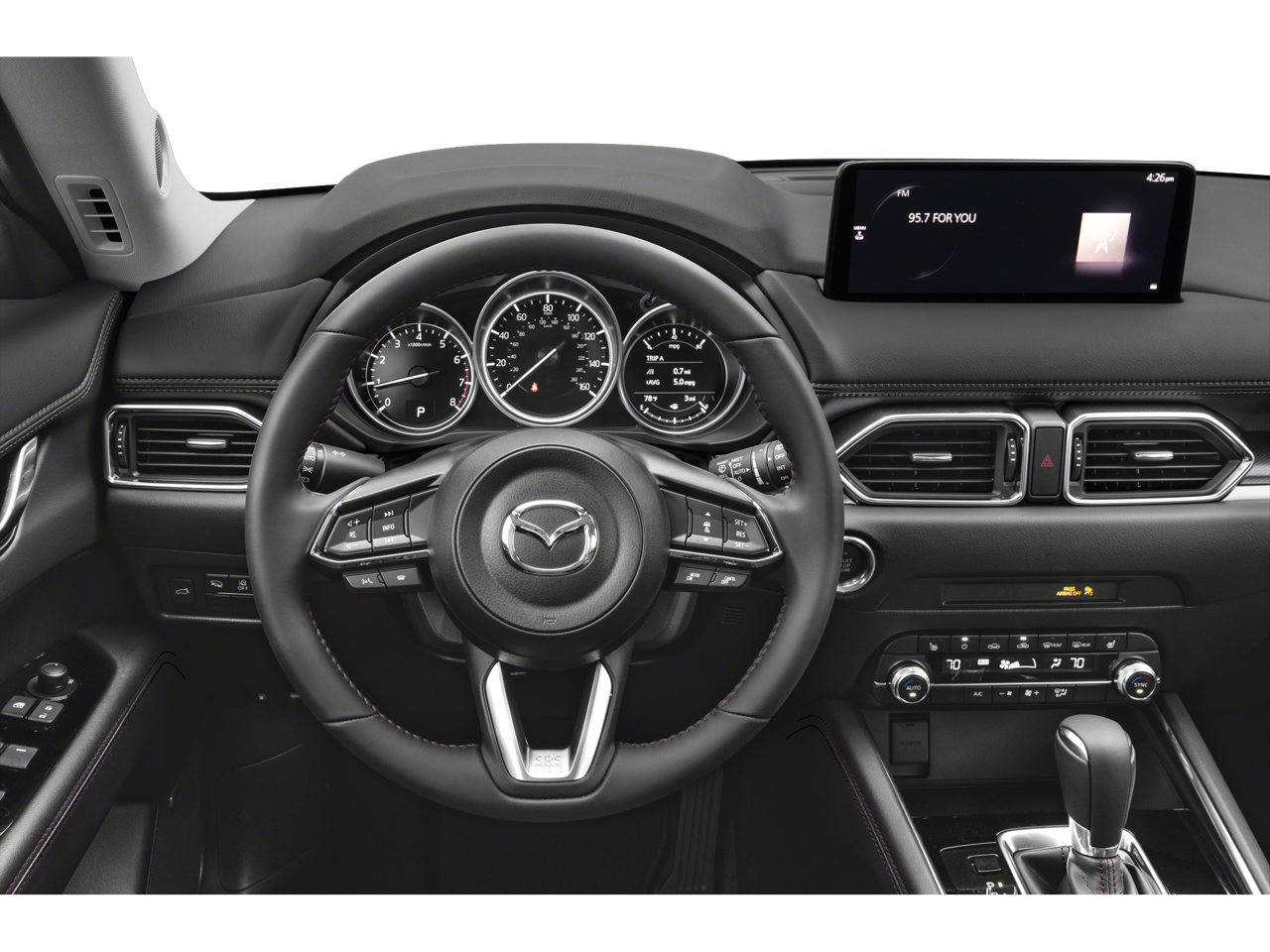 The 2026 Mazda CX-70 Plug-In Hybrid offers Mazda i-ACTIVSENSE® safety features such as blind spot monitoring and automatic emergency braking, depending on trim. These systems are designed to support driver awareness during commuting and highway travel.